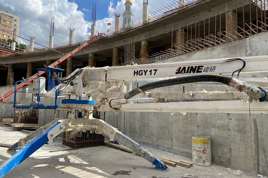 Использование гидравлической стрелы обеспечивает быструю, равномерную и контролируемую подачу бетона, что особенно важно при работе на высоте и в стеснённых условиях. Это позволяет сократить сроки строительства и повысить качество монолитных конструкций.